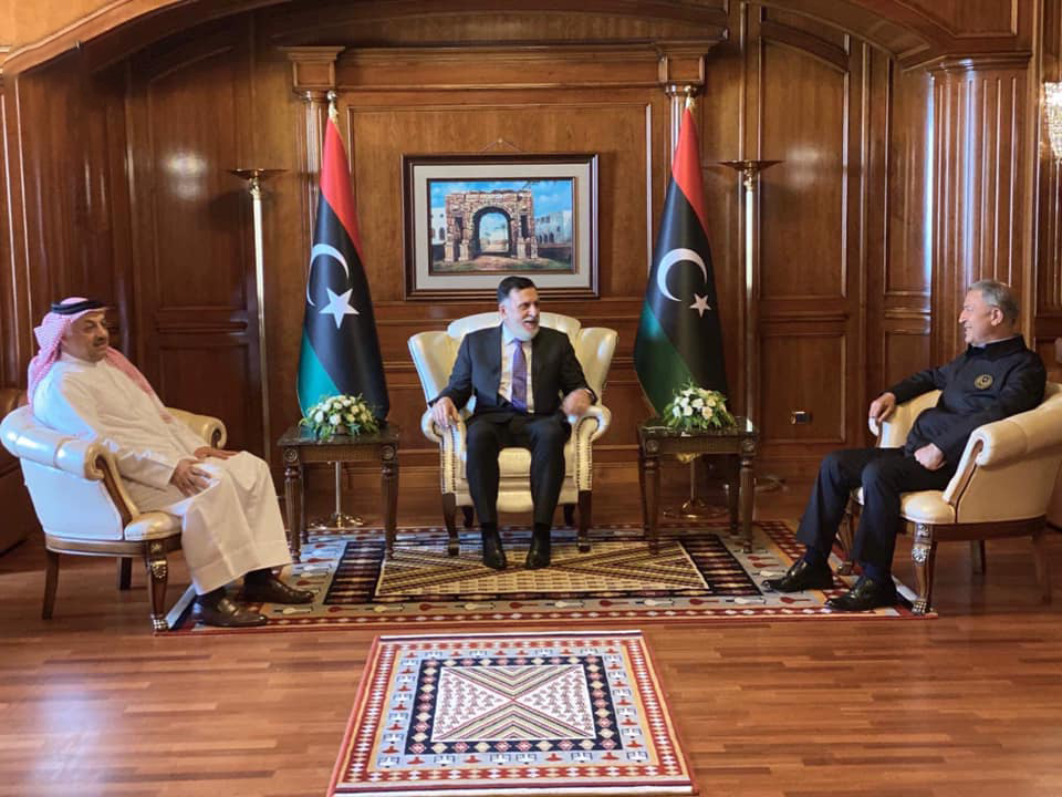 استقبل رئيس المجلس الرئاسي لحكومة الوفاق الوطني فائز السراج، اليوم الاثنين، كل من وزير الدفاع التركي خلوصي آكار، ووزير دفاع دولة قطر خالد بن محمد العطية، بحضور أعضاء الوفدين المرافقين للوزيرين ويضمان كل من رئيس الأركان التركي وسفيري البلدين لدى ليبيا وعدد من كبار المسؤولين في البلدين.