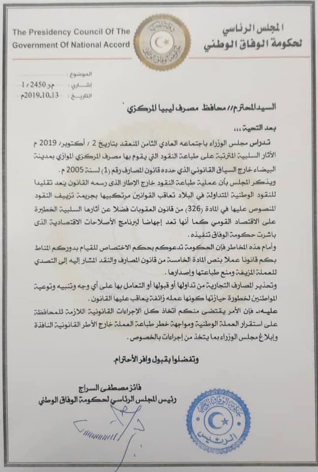 وقال السراج في خطاب له موجه إلى محافظ المصرف المركزي، إنه ناقش الآثار السلبية المترتبة على طباعة النقود التي قام بها المصرف المركزي الموازي في مدينة البيضاء خارج السياق القانوني الذي حدده قانون المصارف.