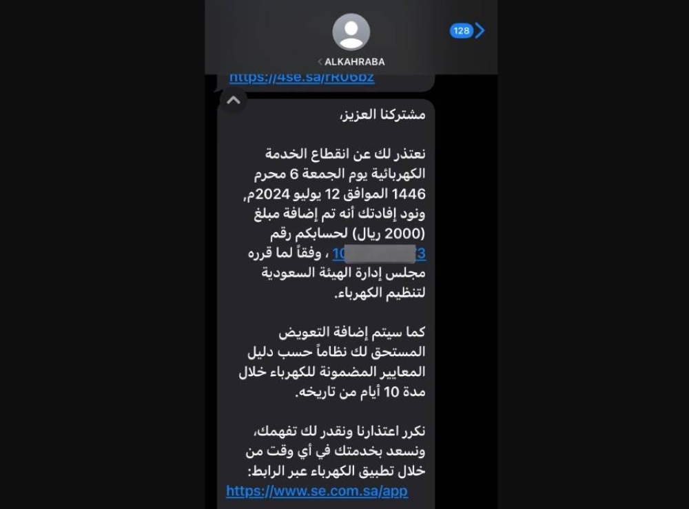 ونشرت الصحيفة صورة لإحدى تلك الرسائل النصية، جاء فيها أن “الشركة السعودية للكهرباء “تعتذر عن انقطاع الخدمة الكهربائية يوم الجمعة 6 محرم، الموافق 12 يوليو 2024″، ووفقا للرسالة، فقد حصل المشترك على تعويض يقدر بألفي ريال، أي ما يعادل 533 دولارا أميركيا، وسيضاف ذلك التعويض المادي كرصيد لكل مشترك في حسابه لدى شركة الكهرباء”.