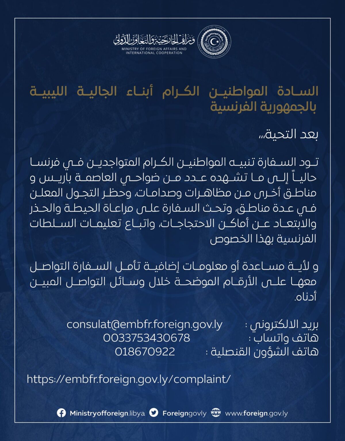 دعت السفارة الليبية باريس والقنصلية العامة مرسيليا، المواطنين الليبيين المتواجدين والمقيمين بالساحة الفرنسية إلى ضرورة توخي الحذر في حركتهم وسفرهم نظراً لما ما تشهده عدد من ضواحي العاصمة باريس ومناطق أخرى من مظاهرات وصدامات، وحظر التجول المعلن في عدة مناطق.