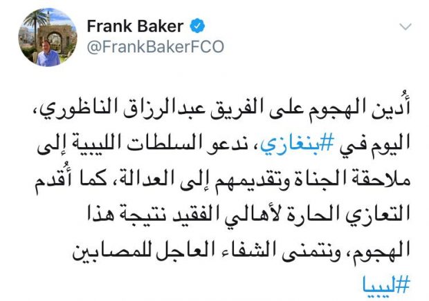 السفير البريطاني لدى ليبيا، فرانك بيكر: «أُدين الهجوم على الفريق عبدالرزاق الناظوري، اليوم في بنغازي، وندعو السلطات الليبية إلى ملاحقة الجُناة وتقديمهم إلى العدالة، كما أُقدم التعازي الحارة لأهالي الفقيد نتيجة هذا الهجوم، ونتمنى الشفاء العاجل للمصابين ليبيا».