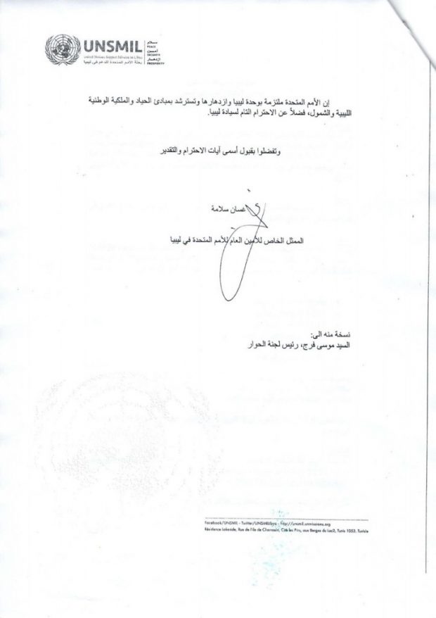 وأكد سلامة إلتزام الأمم المتحدة بوحدة ليبيا واسترشادها بمبادئ الملكية الوطنية الليبية والشمول فضلًا عن الإحترام التام لسيادة ليبيا.
