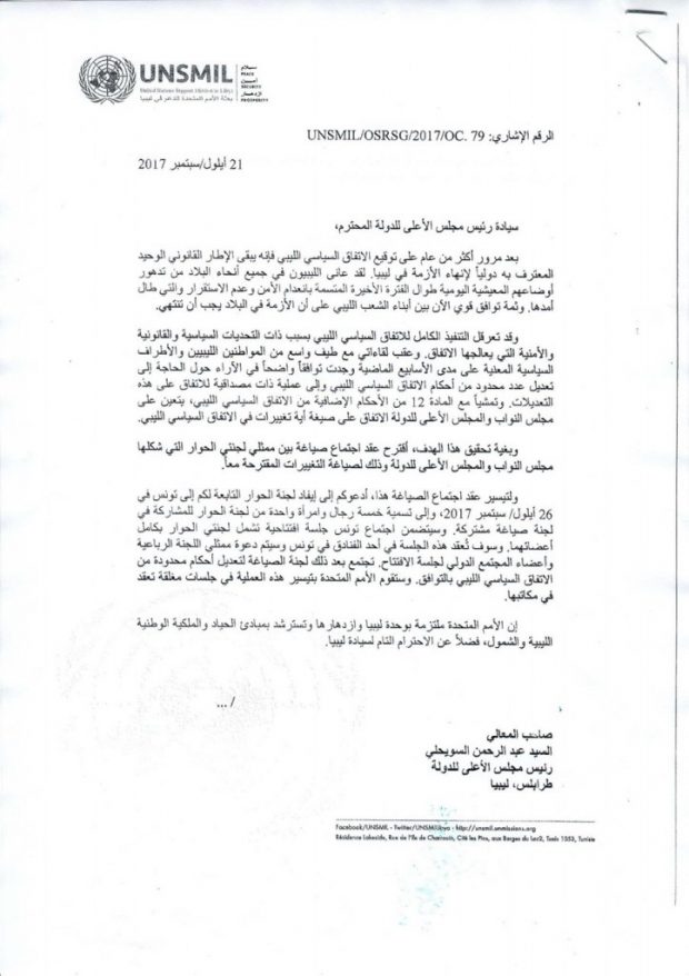 تلقّى رئيس المجلس الأعلى للدولة عبدالرحمن السويحلي رسالةً رسمية من الممثل الخاص للأمين العام للأمم المتحدة في ليبيا غسان سلامة يدعوه فيها إلى إيفاد لجنة تعديل الإتفاق السياسي بالمجلس الأعلى للدولة إلى تونس للبدء في الجولة الأولى من مفاوضات تعديل الإتفاق السياسي بالشراكة مع مجلس النواب وفقًا للمادة 12 من الإتفاق ذاته.