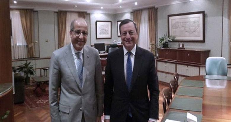 بحث محافظ مصرف ليبيا المركزي “الصديق الكبير” مع محافظ البنك الأوروبي “ماريو دراجي” سبل التعاون والتنسيق بين المركزي والبنوك الأوروبية بما يساهم في مجال تذليل التحديات التي تواجه القطاع المصرفي في ليبيا.