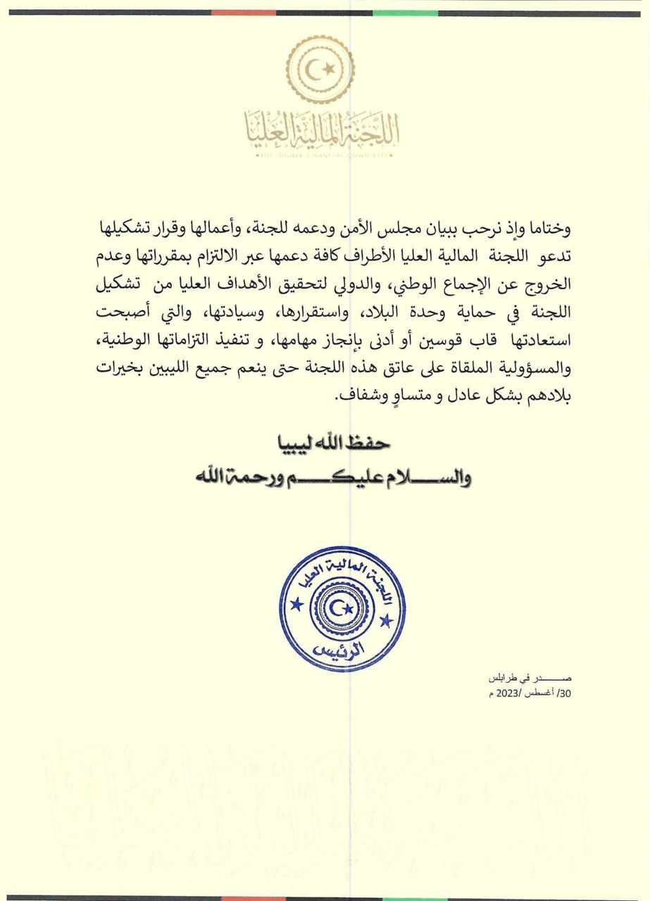 هذا ورحبت اللجنة ببيان مجلس الأمن الدولى ودعمه لها، داعية كافة الأطراف الى دعمها عبر الالتزام بمقرراتها وعدم الخروج عن الإجماع الوطني، والدولي لتحقيق الأهداف العليا من تشكيل اللجنة في حماية وحدة البلاد، واستقرارها، وسيادتها، والتي أصبحت استعادتها قاب قوسين أو أدنى بإنجاز مهامها، وتنفيذ التزاماتها الوطنية، والمسؤولية الملقاة على عاتق هذه اللجنة حتى ينعم جميع الليبيين بخيرات بلادهم بشكل عادل ومتساو وشفاف.
