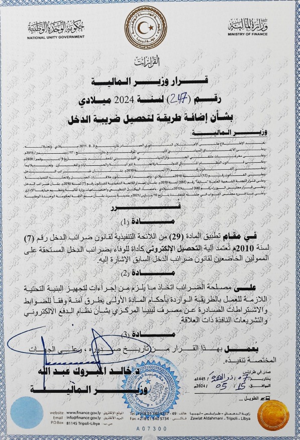 قرر وزير المالية بحكومة الوحدة الوطنية خالد المبروك، اعتماد آلية التحصيل الإلكتروني كأداة لسداد ضرائب الدخل المستحقة على الممولين الخاضعين لقانون ضرائب الدخل.