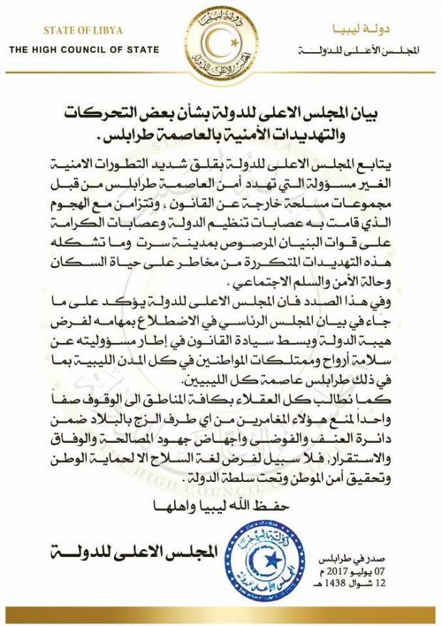 قال المجلس الأعلى للدولة إنه يتابع بقلق شديد التطورات الأمنية «الغير مسؤولة» والتي تهدد أمن العاصمة طرابلس من قبل مجموعات مسلحة «خارجة عن القانون».