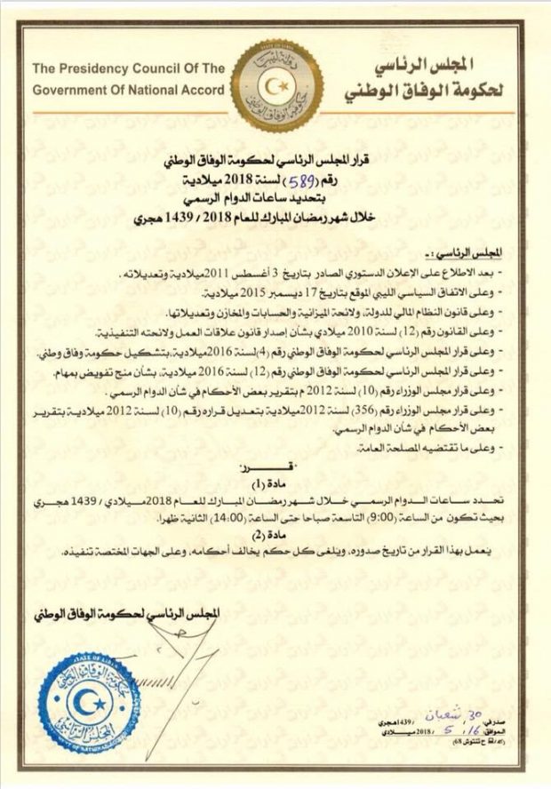 المجلس الرئاسي لحكومة الوفاق الوطني يصدر قراراً بشأن تحديد ساعات الدوام الرسمي خلال شهر رمضان المبارك