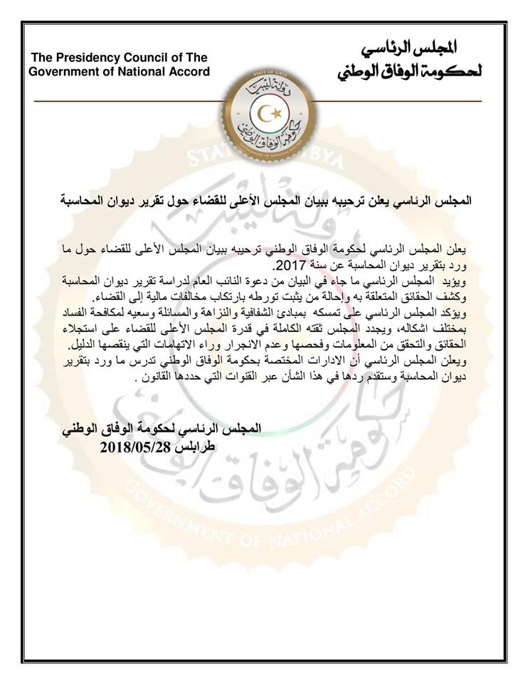 المجلس الرئاسي لحكومة الوفاق الوطني يُعلن ترحيبه ببيان المجلس الأعلى للقضاء حول تقرير ديوان المحاسبة.