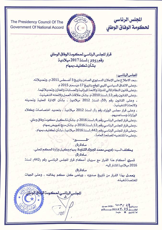 أصدر المجلس الرئاسي لحكومة الوفاق الوظني قرارا يقضي بتكليف ” ادريس محمد المبروك الشاردة ” وكيلا لوزارة الحكم المحلي بحكومة الوفاق الوطني .