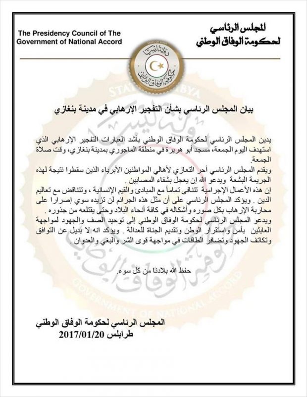 دان المجلس الرئاسي لحكومة الوفاق الوطني بأشد العبارات التفجير الإرهابي الذي استهدف مسجد أبو هريرة في منطقة الماجوري بمدينة بنغازي، اليوم، وقت صلاة الجمعة.