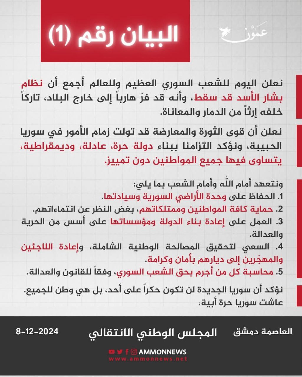 إننا في هذا اليوم التاريخي، نعلن أن قوى الثورة والمعارضة قد تولت زمام الأمور في سوريا الحبيبة، ونؤكد التزامنا ببناء دولة حرة، عادلة، وديمقراطية، يتساوى فيها جميع المواطنين دون تمييز.