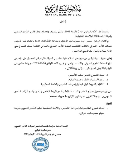 أعلن مصرف ليبيا المركزي، شروعه في استلام طلبات تأسيس الشركات الراغبة في الحصول على تراخيص المزاولة نشاط التأجير التمويلي، وذلك اعتباراً من تاريخ يوم الأحد الموافق 26-01-2025 عبر رابط خاص على الموقع الإلكتروني المصرف ليبيا المركزي.