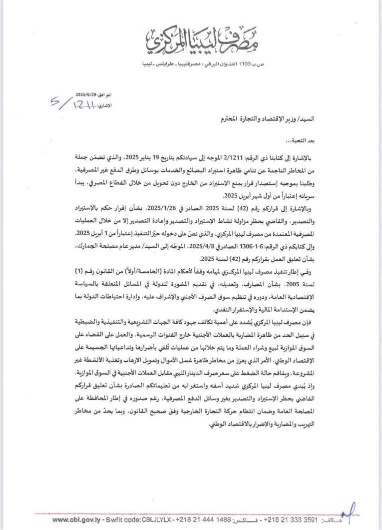 ودعا المصرف الوزارة إلى مراجعة قرارها، والتنسيق مع مصلحة الجمارك لتطبيق الحظر على عمليات الاستيراد والتصدير وإعادة التصدير خارج القنوات المصرفية، بما يعزز الشفافية، ويحافظ على الاستقرار النقدي، ويصون المصلحة العامة.