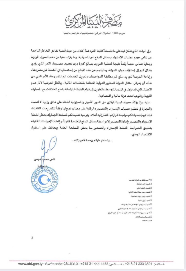 وشدد مصرف ليبيا المركزي على أن استمرار الاستيراد دون تحويلات مصرفية يساهم في استنزاف موارد الدولة، ويضعف قدرة السلطات على الرقابة، ويهدد بتقويض التزامات ليبيا أمام المعايير الدولية لمكافحة غسل الأموال وتمويل الإرهاب، مما قد يؤدي في الأجل المتوسط والبعيد إلى قطع العلاقات المصرفية الدولية عن ليبيا ووقوعها في عزلة مالية واقتصادية.