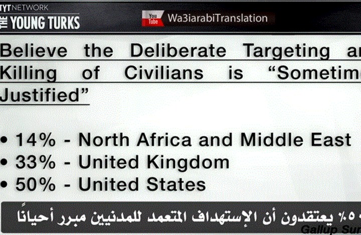 وكانت المفاجأة الصادمة أن 86 بالمئة من المسلمين في الشرق الأوسط يرفضون تبرير قتل المدنيين تحت أي ظرف، وفقط 14 بالمئة منهم يرونه مبررا، فيما رأى 33 بالمئة من البريطانيين أن قتل المدنيين مبرر، والأكثر صدمة أن 50 بالمئة من الأمريكيين يرون قتل المدنيين أمرا مبررا في بعض الأحيان، ويقدمون المبررات لذلك، ويدافعون عنها.