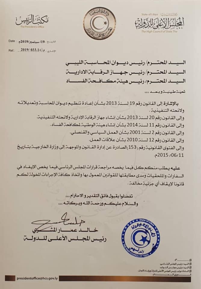 طالب رئيس الأعلى للدولة خالد المشري، بمراجعة قرارات المجلس الرئاسي فيما يخص الإيفاد في السفارات والملحقيات، ومدى مطابقتها للقوانين المعمول بها، واتخاذ الإجراءات الكفيلة بإيقاف أي جزئية مخالفة.