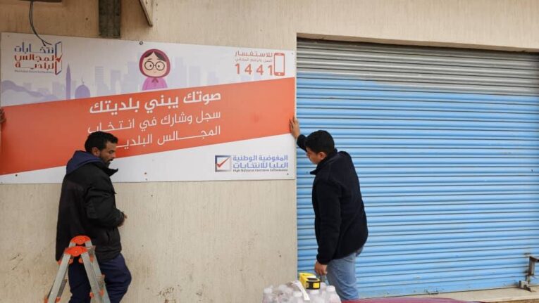 نشرت المفوضية العليا للانتخابات صورا تظهر بدء مكاتب الإدارة الانتخابية تركيب اللوحات الجدارية لتعزيز الوعي بأهمية التسجيل في سجل الناخبين.