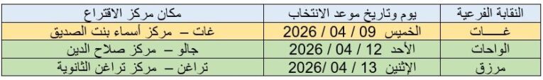 وأوضحت المفوضية أن الانتخابات ستُجرى في مناطق غات والواحات ومرزق، وفق الجداول المعتمدة لكل منطقة، على أن تُفتح مراكز الاقتراع أمام الناخبين من الساعة التاسعة صباحاً وحتى الثانية ظهراً، داعية الجميع إلى الالتزام بالمواعيد لضمان سير العملية الانتخابية بسلاسة.