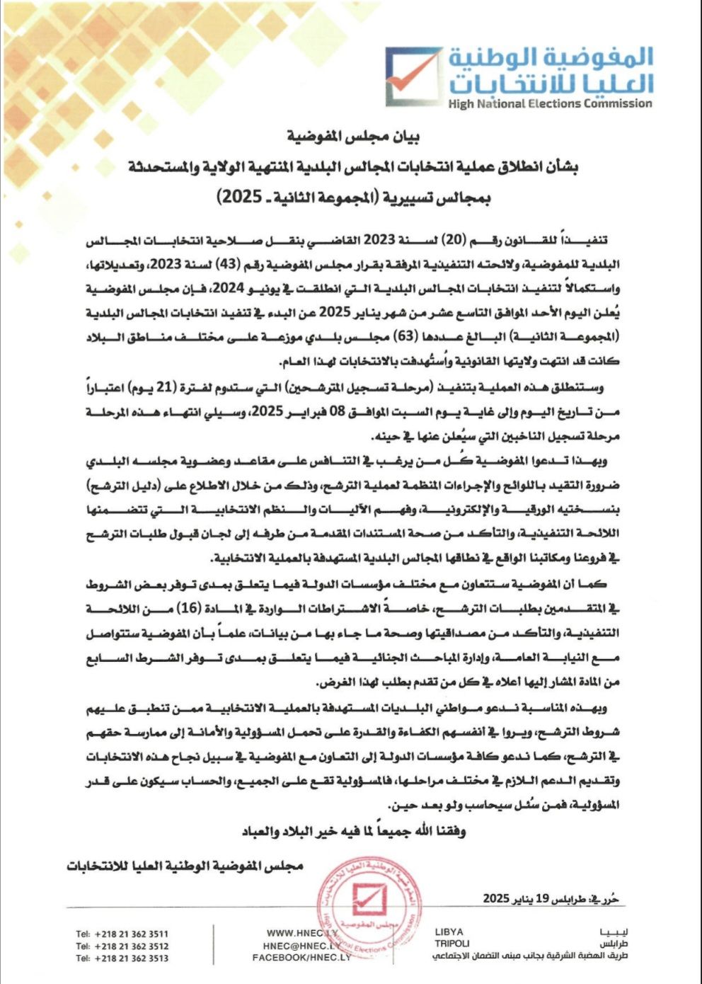 أصدرت المفوضية الوطنية العليا للانتخابات، بيانا بشأن انطلاق عملية انتخابات المجالس البلدية المنتهية الولاية والمستحدثة بمجالس تسييرية (المجموعة الثانيةــ 2025)