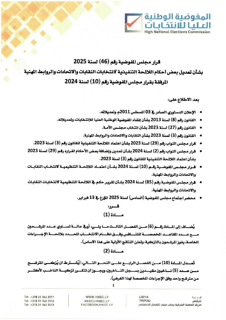 نشرت المفوضية الوطنية العليا للانتخابات، القرار رقم (46) لسنة 2025، بشأن تعديل بعض أحكام اللائحة التنفيذية لانتخابات النقابات والاتحادات والروابط المهنية المرفقة بقرار مجلس المفوضية رقم (10) لسنة 2024.