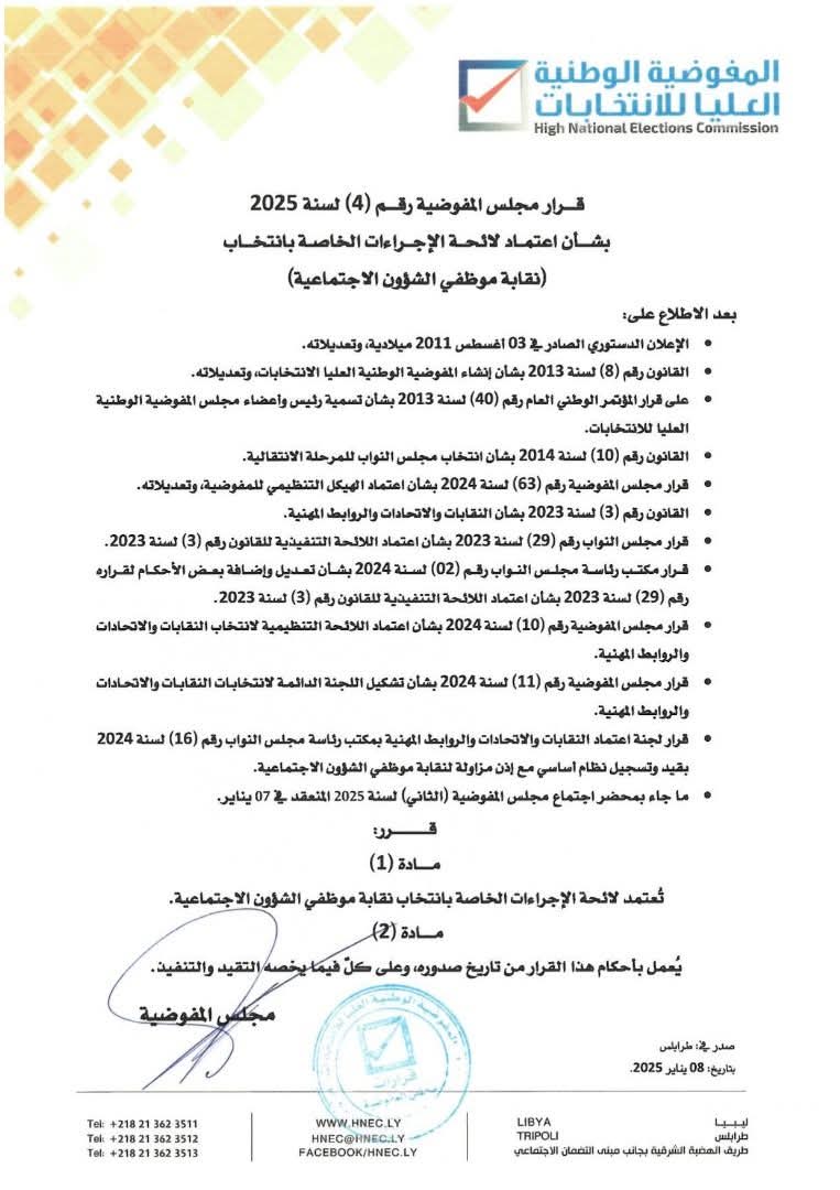 كذلك أصدرت المفوضية، القرار رقم (4) لسنة 2025، بشأن اعتماد لائحة الإجراءات الخاصة بانتخاب (نقابة موظفي الشؤون الاجتماعية).