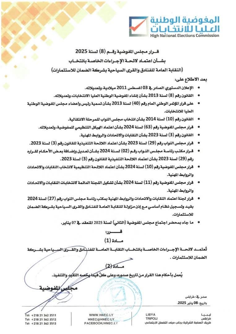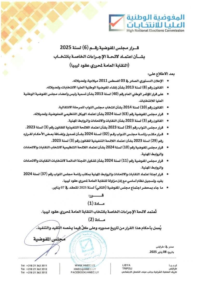 كما اصدرت المفوضية القرار رقم (6) لسنة 2025، بشأن اعتماد لائحة الإجراءات الخاصة بانتخاب (النقابة العامة لمحرري عقود ليبيا).