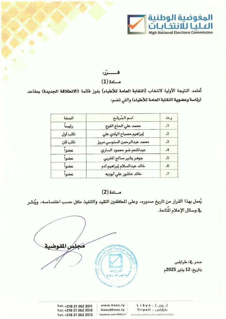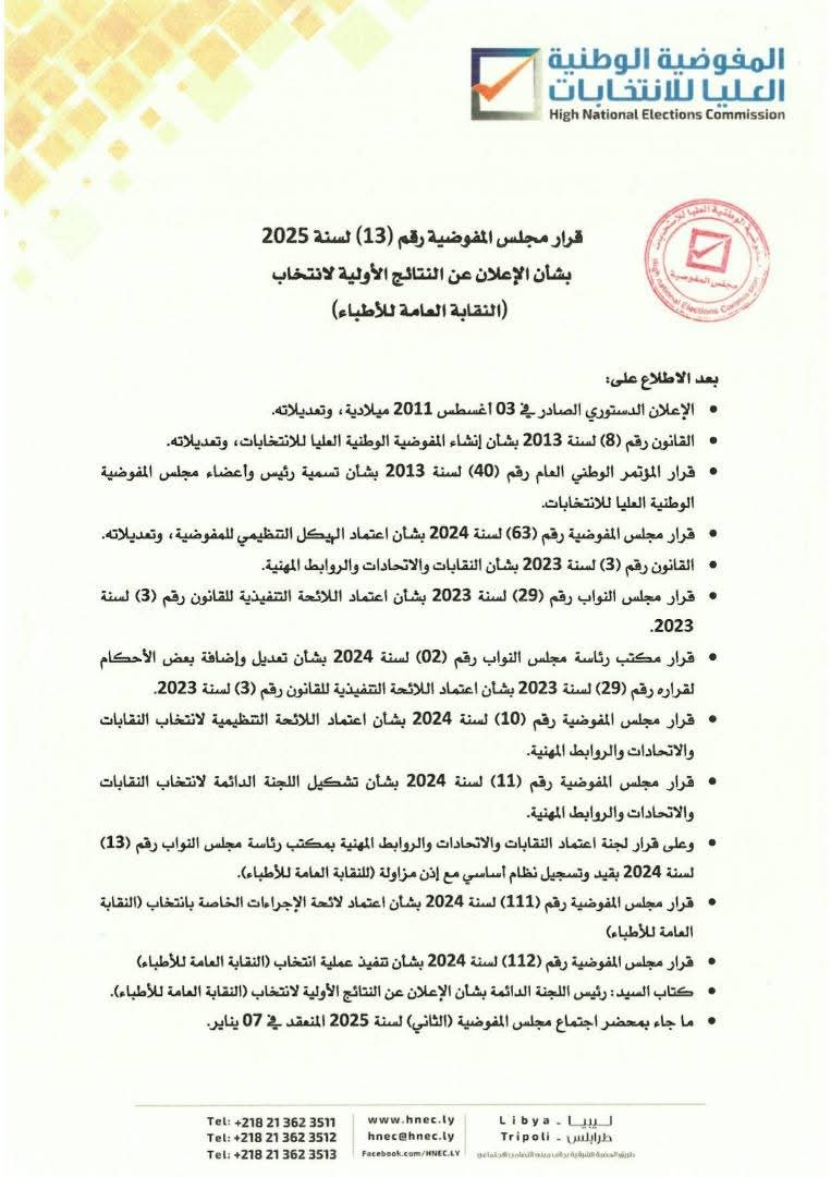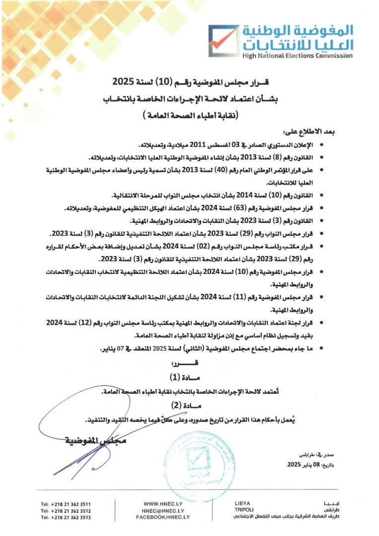 اصدرت المفوضية الوطنية العليا للانتخابات، القرار رقم (10) لسنة 2025، بشأن اعتماد لائحة الإجراءات الخاصة بانتخاب (نقابة أطباء الصحة العامة).