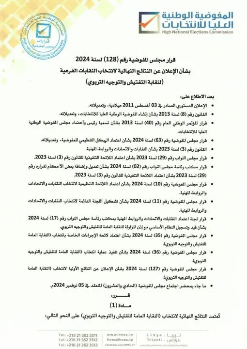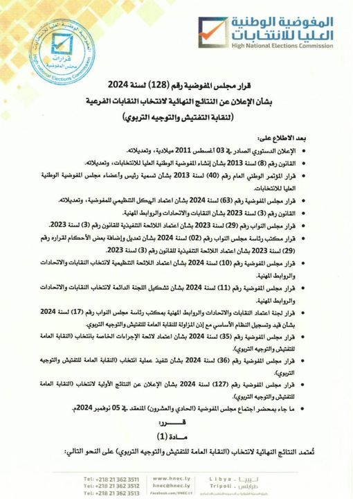 أصدرت المفوضية الوطنية العليا للانتخابات القرار رقم (128) لسنة 2024 بشأن الإعلان عن النتائج النهائية لانتخاب النقابات الفرعية (لنقابة التفتيش والتوجيه التربوي).