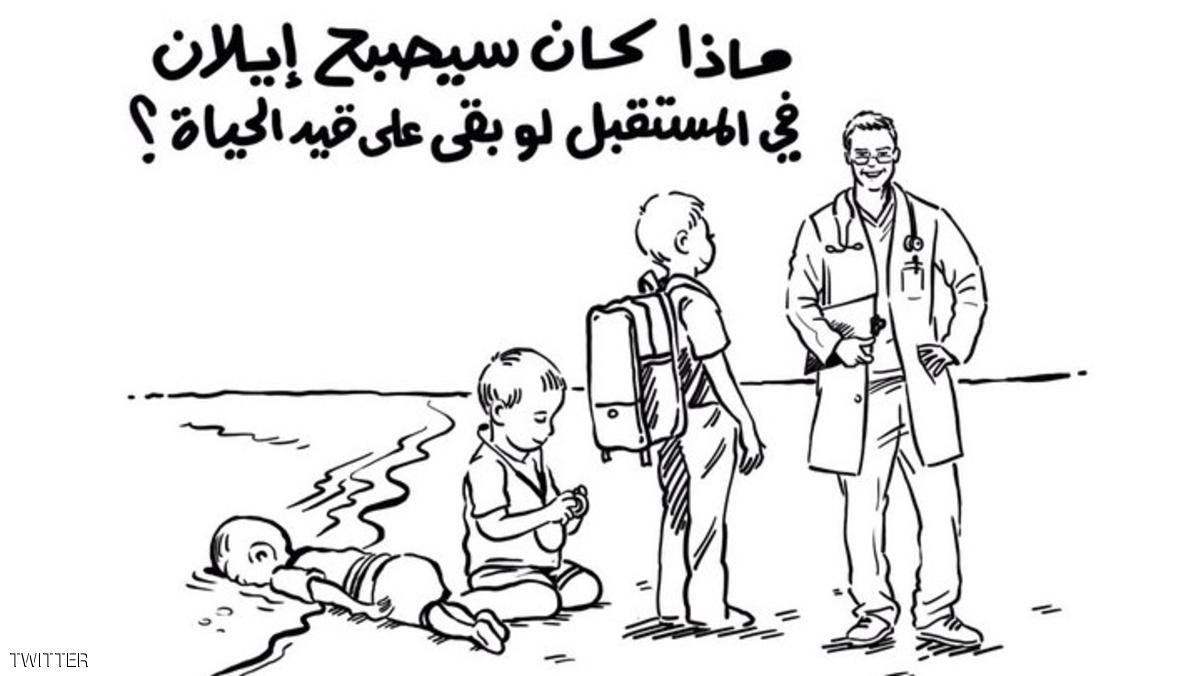 ونشرت الملكة رانيا على حسابها بموقع التواصل الاجتماعي “تويتر” تغريدة مرفقة برسومات كاريكاتيرية للفنان أسامة حجاج تصور الطفل إيلان طبيبا، كتب عليها باللغات العربية والإنجليزية والفرنسية: “ماذا كان سيصبح إيلان في المستقبل لو بقي على قيد الحياة؟”.