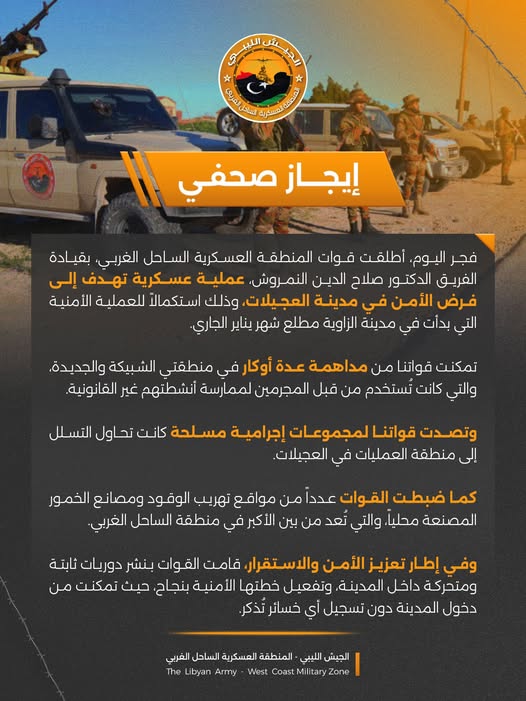 فجر اليوم، أطلقت قوات المنطقة العسكرية الساحل الغربي، بقيادة الفريق الدكتور صلاح الدين النمروش، عملية عسكرية تهدف إلى فرض الأمن في مدينة العجيلات، وذلك استكمالاً للعملية الأمنية التي بدأت في مدينة الزاوية مطلع شهر يناير الجاري.