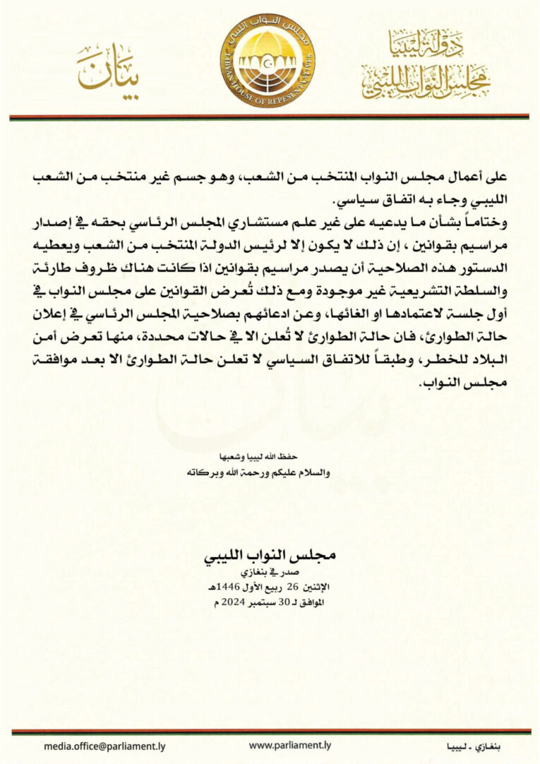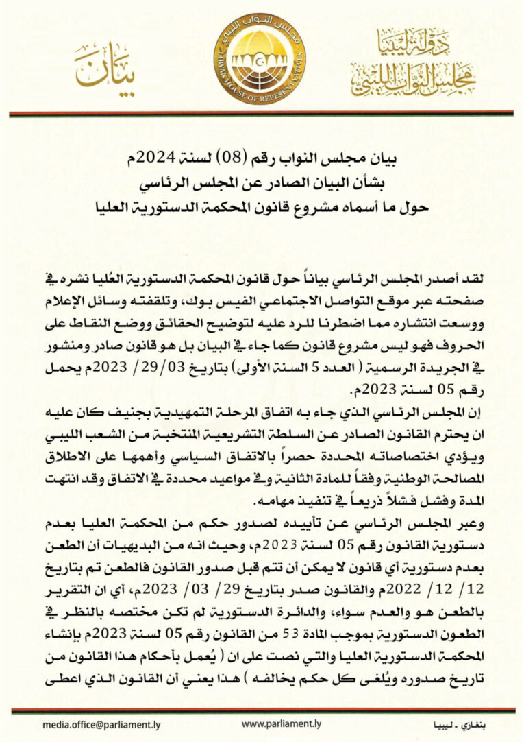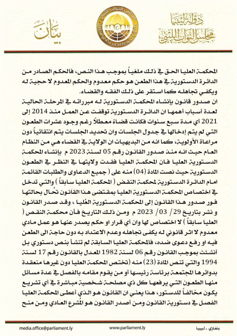 ورداً على دعوات من المجلس الرئاسي لإعادة النظر في هذا القانون، جاء في البيان، “أن حكم الدائرة الدستورية بالمحكمة العليا يعد منعدما، وذلك لصدوره قبل إقرار قانون إنشاء المحكمة الدستورية العليا من قبل مجلس النواب”.