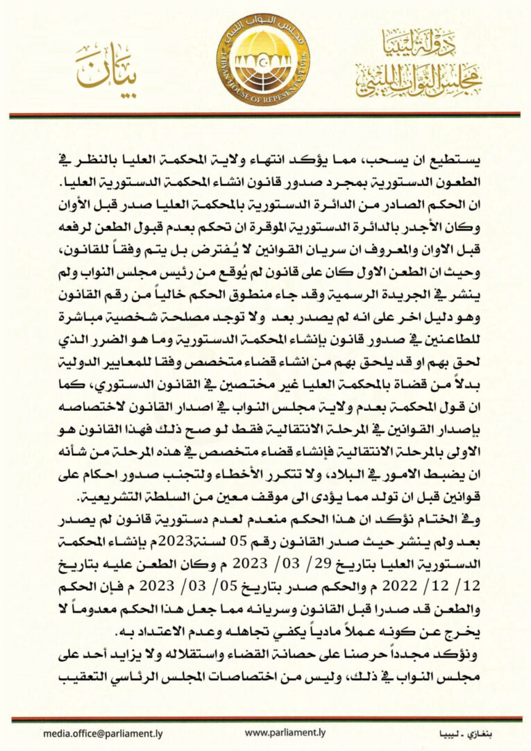 وانتقد مجلس النواب “ادعاء المحكمة العليا بأنها لا تملك ولاية في إصدار قانون إنشاء المحكمة الدستورية”، مؤكدا أن “هذا القانون هو الأول من نوعه في المرحلة الانتقالية، وأن إنشاء قضاء متخصص في هذه المرحلة أمر ضروري لضبط الأمور في البلاد وتجنب تكرار الأخطاء”.