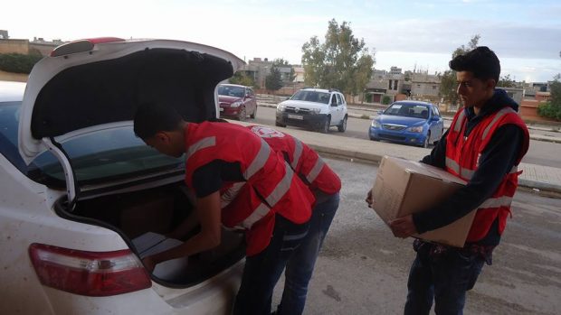 يواصل فرع الهلال الأحمر الليبي في مدينة شحات توزيع المواد الإغاثية على الأسر النازحة بالمدينة.