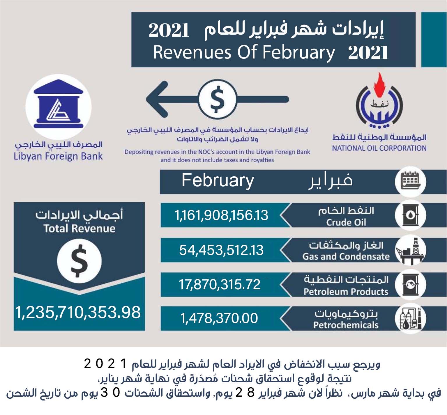 أعلنت المؤسسة الوطنية للنفـط، اليوم الأحد، إن الإيراد العام من مبيعات النفط الخام ومشتقاته في شهر فبراير للعام 2021 قد سجلت مستوى 1,235,710,353.98 دولار أمريكي، تم إيداعها بحساب المؤسسة الوطنية للنفط لدى المصرف الليبي الخارجي بطرابلس تماشيا مع الترتيبات الوقتية المعمول بها والتي انتهت بتشكيل حكومة الوحدة الوطنية التي نالت الثقة مؤخرا.