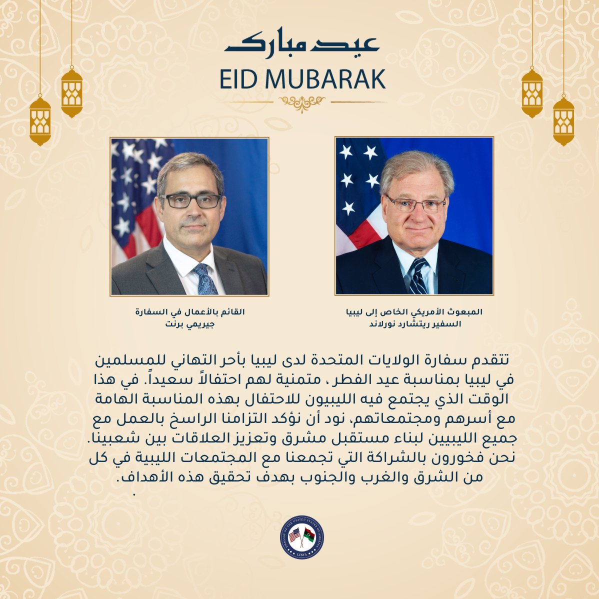 وفي رسالة تهنئة نشرتها على صفحتها بموقع “فيسبوك” بمناسبة حلول عيد الفطر المبارك، قالت السفارة الأميركية لدى ليبيا، : “في هذا الوقت الذي يجتمع فيه الليبيون للاحتفال بهذه المناسبة المهمة مع أسرهم ومجتمعاتهم نود أن نؤكد التزامنا الراسخ بالعمل مع جميع الليبيين لبناء مستقبل مشرق وتعزيز العلاقات بين شعبينا، نحن فخورن بالشراكة التي تجمعنا مع المجتمعات الليبية في كل من الشرق والغرب والجنوب بهدف تحقيق هذه الأهداف”.