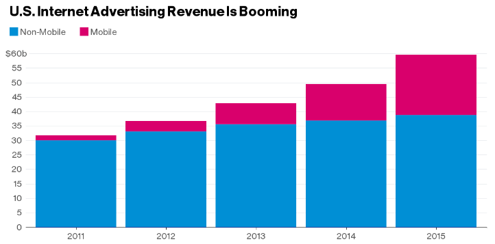 المثير للاهتمام النمو الكبير في حصة سوق الإعلانات الموجهة للهواتف الذكية كمنصة تكبر يوماً بعد يوم لكنها لم تأكل من حصة أجهزة الكمبيوتر. بحسب الرسم البياني أعلاه فإن حوالي 70% من عائدات الإعلانات كانت من المنصة غير المحمولة والباقي من الهواتف الذكية.