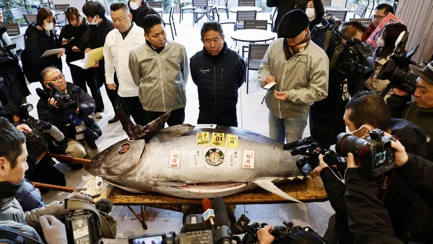 وذكرت هيئة الإذاعة العامة اليابانية NHK أن المزاد بدأ بعد الساعة الخامسة صباحاً بقليل، حيث اجتذبت أسماك التونة المجمدة والطازجة عروضاً من البلاد وحول العالم. وهذا العام، بيعت سمكة التونة العملاقة بأكثر من 2100 دولار للرطل، مما جعل شرائح الساشيمي باهظة الثمن للغاية.