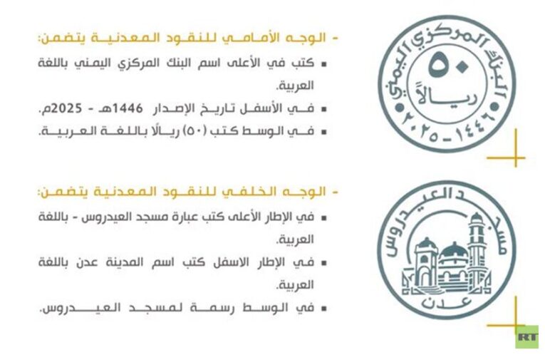 أعلن البنك المركزي اليمني في صنعاء، الخاضع لسيطرة جماعة أنصار الله (الحوثيين)، عن بدء تداول عملة معدنية جديدة من فئة 50 ريالا، وذلك اعتباراً من الأحد 13 يوليو 2025، في خطوة تهدف إلى استبدال الأوراق النقدية التالفة وتعزيز جودة النقد المتداول دون التأثير على الكتلة النقدية أو أسعار الصرف.