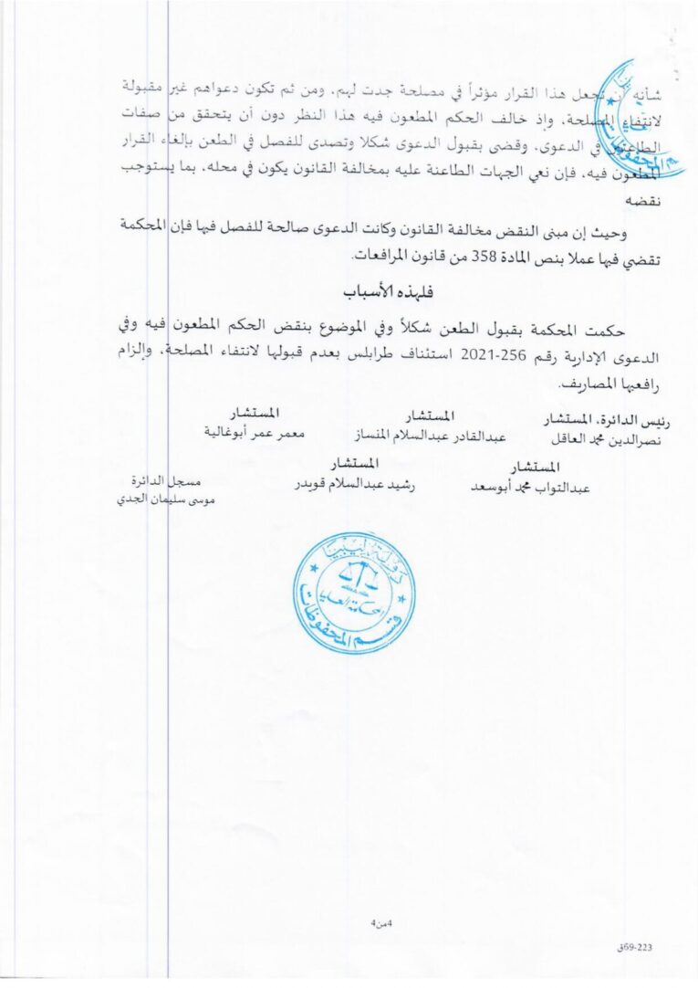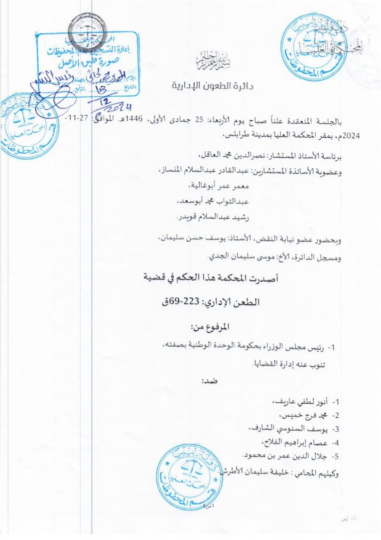 وأعلن المكتب، اليوم الأربعاء، في بيان تحصلت “عين ليبيا” على نسخة منه، عن صدور حكم نهائي وبات من المحكمة العليا الليبية يقضي برفض الطعن المقدم في القضية الإدارية رقم 223/69 ق.