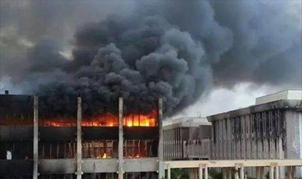 تناقل نشطاء على مواقع التواصل الاجتماعي، الخميس، صورا تظهر حريقا كبيرا شب بكلية الآداب جامعة بنغازي ، التى يتواجد بها بقايا درع ليبيا 2 بقيادة محمد العريبي الشهير «ببوكة».