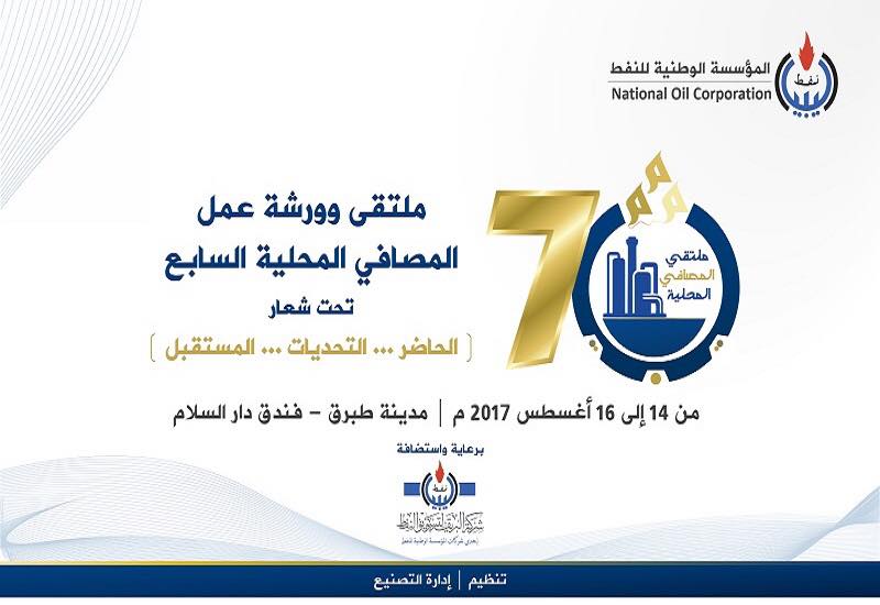 يقام خلال الفترة من 14-16 من شهر أغسطس 2017 ملتقى وورشة عمل مصافي التكرير المحلية السابع، تحت شعار (الحاضر، التحديات، المستقبل) وذلك بفندق دار السلام بمدينة طبرق، يحضره نخبة من المختصين في مجال التكرير والتصنيع بقطاع النفط وذلك لاستعراض أخر التقنيات وتبادل الخبرات.