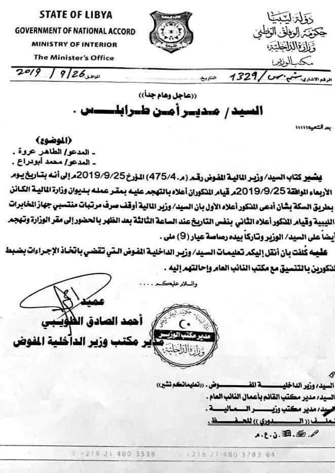 جاء ذلك في رسالة وجهها مدير مكتب الوزير إلى مدير أمن طرابلس، أمر من خلالها بالقبض على كل المتهمين في الحادثة وهما “الطاهر عروة” و”محمد أبودراع”، وإحالتهم إلى مكتب النائب العام.
