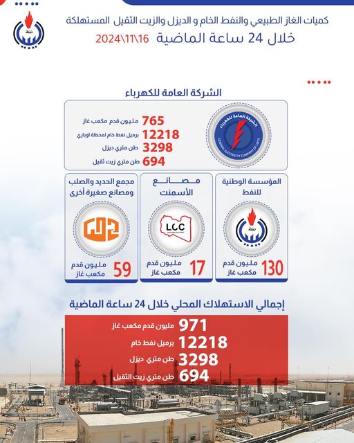 أعلنت المؤسسة الوطنية للنفط، السبت، وصول إجمالي الاستهلاك المحلي للغاز الطبيعي إلى 971 مليون قدم مكعب خلال الـ24 ساعة الماضية.