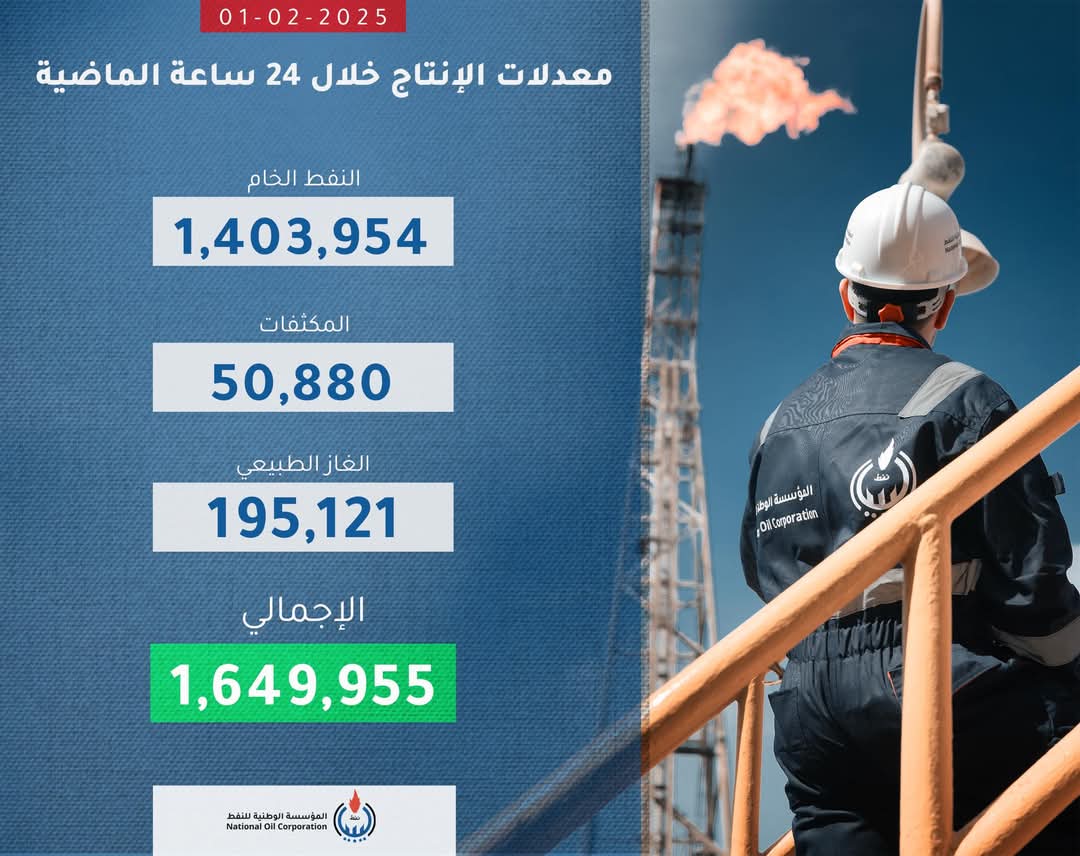 أعلنت المؤسسة الوطنية للنفط، أنه “بلغت معدلات إنتاج ليبيا من النفط الخام اليوم 1،403،954 برميل يومياً، ومن المكثفات 50،880 برميل، فيما سجلت مؤشرات إنتاج الغاز ما قيمته 195،121 برميل مكافئ، ليكون إجمالي الإنتاج قد بلغ 1،649،955 برميل يومياً.