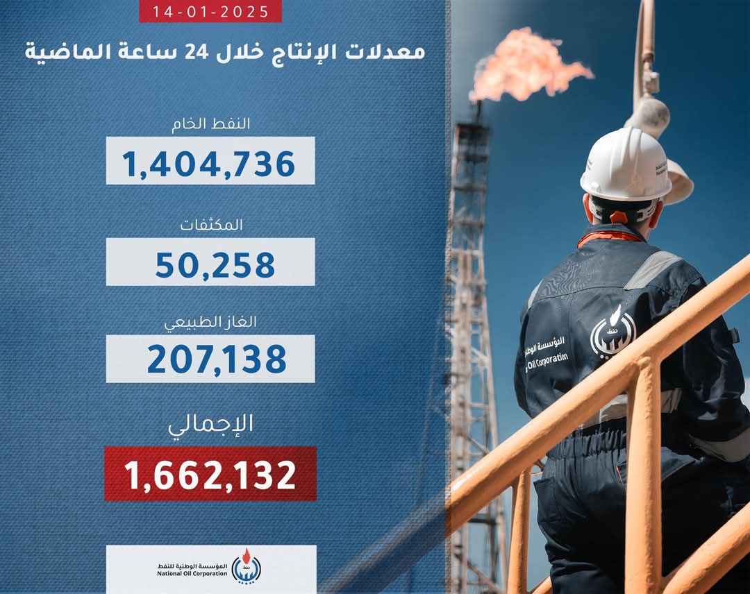 نشرت المؤسسة الوطنية للنفط، معدلات الإنتاج اليومي من النفط الخام والمكثفات والغاز الطبيعي خلال الـ 24 ساعة الماضية.