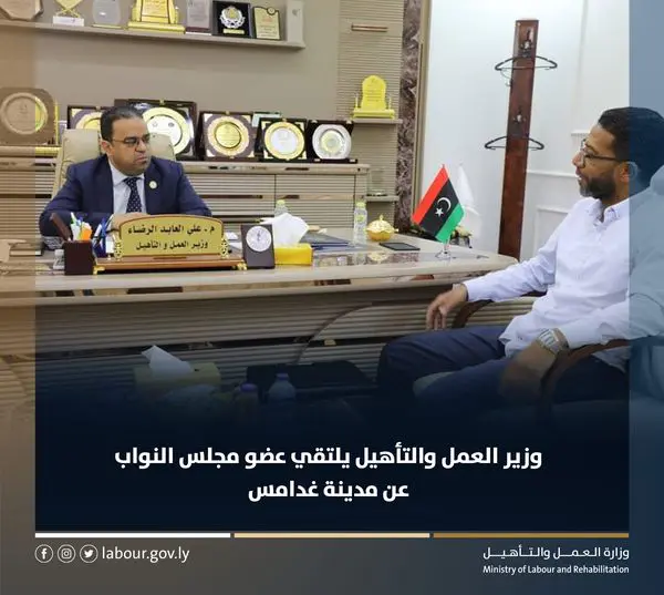 وتطرق اللقاء لدور الوزارة في توفير التدريبات اللازمة للشباب واقحامهم بسوق العمل، وفق التخصصات المطلوبة، كما تناول مرحلة تنظيم الملاكات الوظيفة والإفراجات للمؤسسات بمدينة غدامس.