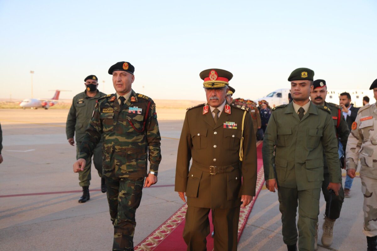 وصل رئيس الأركان العامة الفريق أول ركن محمد الحداد، رفقة عدد من رؤساء الأركانات ومدراء الإدارات والهيئات، الخميس، إلى مدينة بنغازي في أول زيارة رسمية له منذ توليه منصبه، وذلك في إطار استكمال المناقشات بشأن توحيد المؤسسة العسكرية.