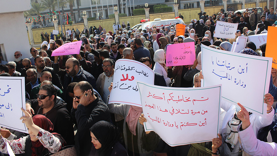 ونقلت قناة “ليبيا الأحرار” عن موظفي الإدارة قولهم، في وقفة احتجاجية أمام مقري رئاسة الوزراء ووزارة المالية لحكومة الوفاق الوطني في العاصمة طرابلس، إن سبب تعليق العمل هو عدم صرف مرتباتهم المتعثرة.