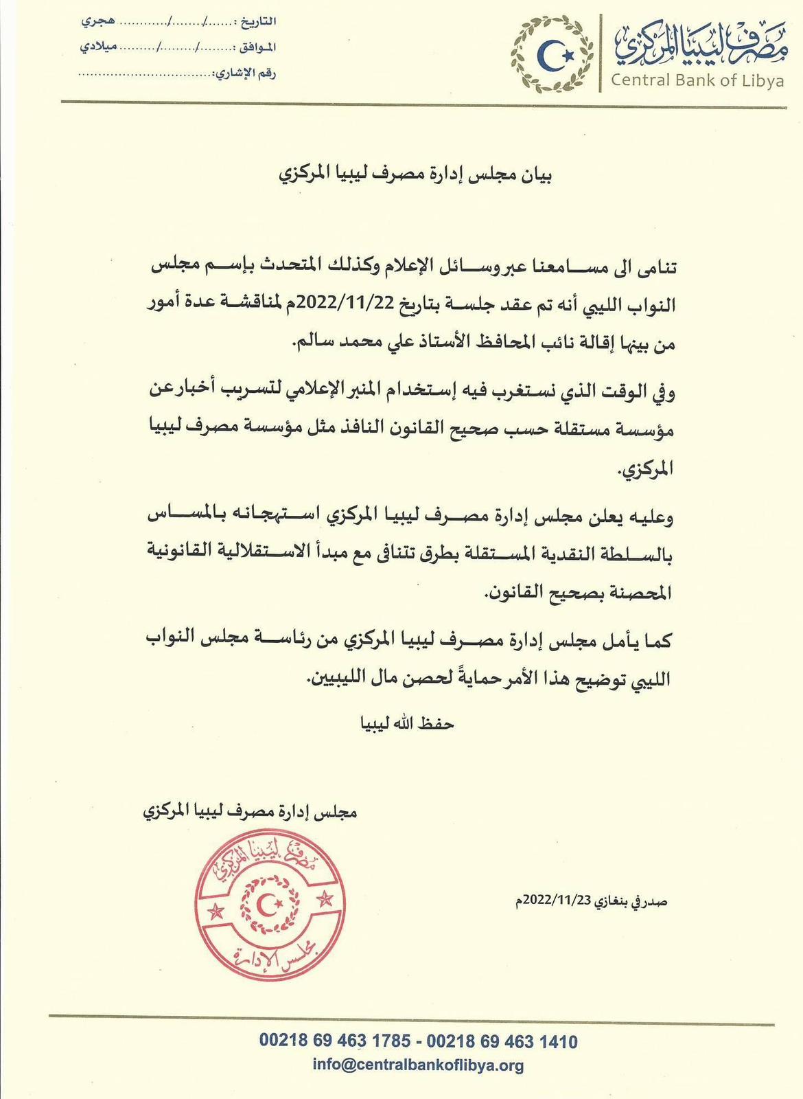 وقال مجلس إدارة المصرف المركزي إنّه يستغرب استخدام المنبر الإعلامي لتسريب أخبار عن مؤسسة مستقلة مثل مصرف ليبيا المركزي، معربا عن أمله من رئاسة مجلس النواب توضيح هذا الأمر حماية لحصن مال الليبيين.